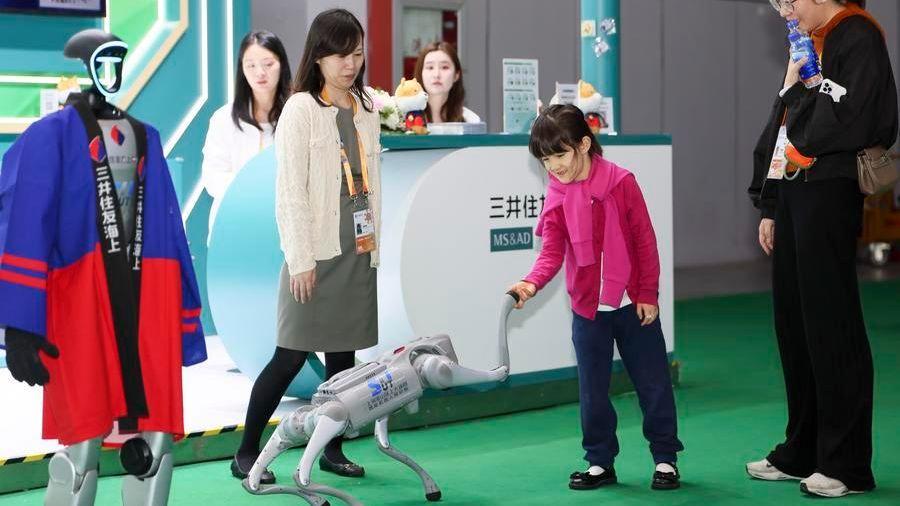 A child interacts with a robotic dog at the Trade in Services Exhibition area during the eighth China International Import Expo (CIIE) in east China's Shanghai, Nov. 9, 2025. (Xinhua/Wang Xiang)