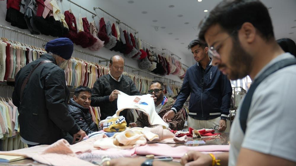 Indian clients select products at a children's clothing market in Zhili Town, Huzhou City of east China's Zhejiang Province, April 13, 2026. Zhili Town in Huzhou City of east China's Zhejiang Province, has stepped up efforts in recent years in the development of its famous children's clothing industry by updating technologies, equipment and products.