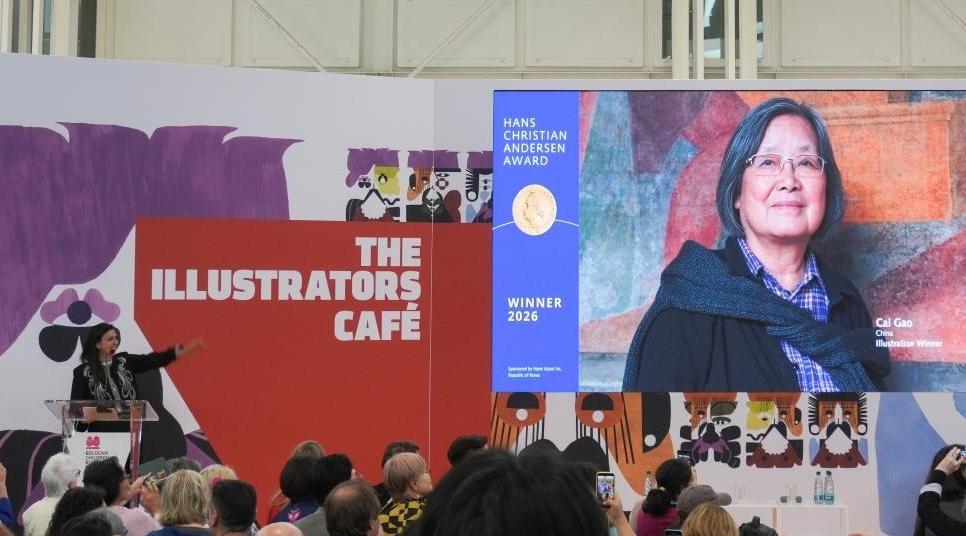 Photo taken on April 13, 2026 shows Chinese illustrator Cai Gao winning the 2026 Hans Christian Andersen Award on the Bologna Children's Book Fair in Bologna, Italy. Chinese illustrator Cai Gao won the 2026 Hans Christian Andersen Award, with the announcement made on Monday at the Bologna Children's Book Fair in Italy. The award was established in 1956 by the International Board on Books for Young People, a leading international organization dedicated to promoting children's books. It is presented biennially to a living author and illustrator whose work has made a lasting contribution to children's literature. (Xinhua/Wang Kaiyan)