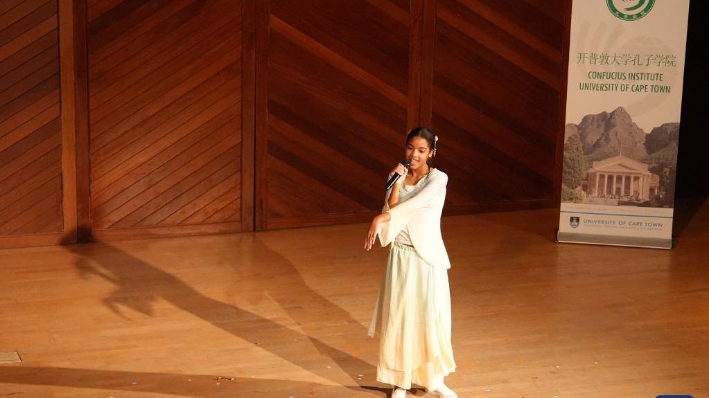 A contestant performs at the fifth Chinese Singing Competition of the Confucius Institute at the University of Cape Town, in Cape Town, South Africa, April 18, 2026. Young students from across Cape Town, South Africa's legislative capital, brought energy and enthusiasm to a celebration of Chinese culture on Saturday, as the Confucius Institute at the University of Cape Town (CIUCT) staged its fifth Chinese Singing Competition, highlighting the idea that music can serve as a bridge between cultures.(Xinhua/Wang Lei)