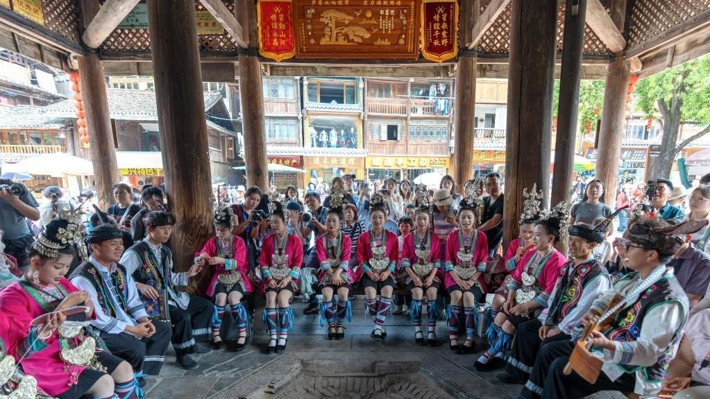 Tourists pose for photos during a folk activity in Zhaoxing Dong Village of Liping County, southwest China's Guizhou Province, April 18, 2026.