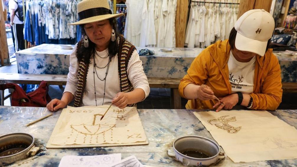 Tourists draw patterns on fabrics in Zhaoxing Dong Village of Liping County, southwest China's Guizhou Province, April 20, 2026.