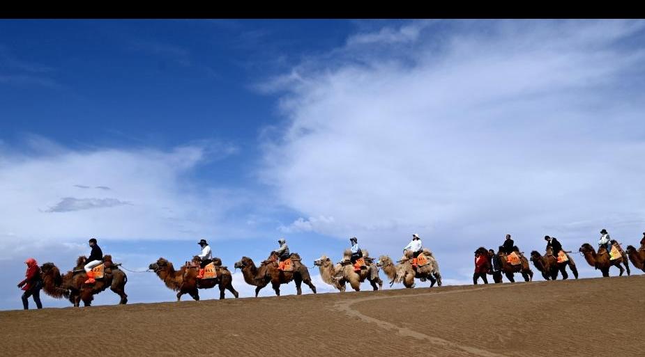 Tourists visit the Mingsha Mountain and Crescent Spring Scenic Area in Dunhuang City, northwest China's Gansu Province, April 27, 2026. As the May Day holiday approaches, the tourism markets across the country are heating up. (Photo by Zhang Xiaoliang/Xinhua)