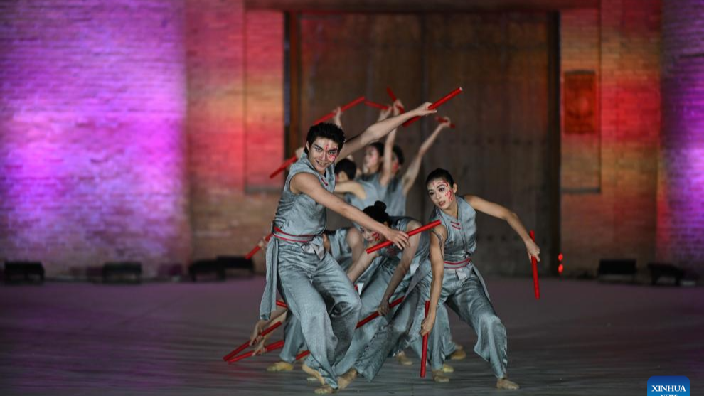 TASHKENT, April 29 (Xinhua) -- Dressed in flowing blue costumes and wielding red drumsticks, nine young dancers from the Beijing Dance Academy moved in perfect unison to rhythmic beats on a grand stage set within the ancient Ichan-Kala complex in Khiva, Uzbekistan, their movements crisp yet fluid as the performance unfolded.